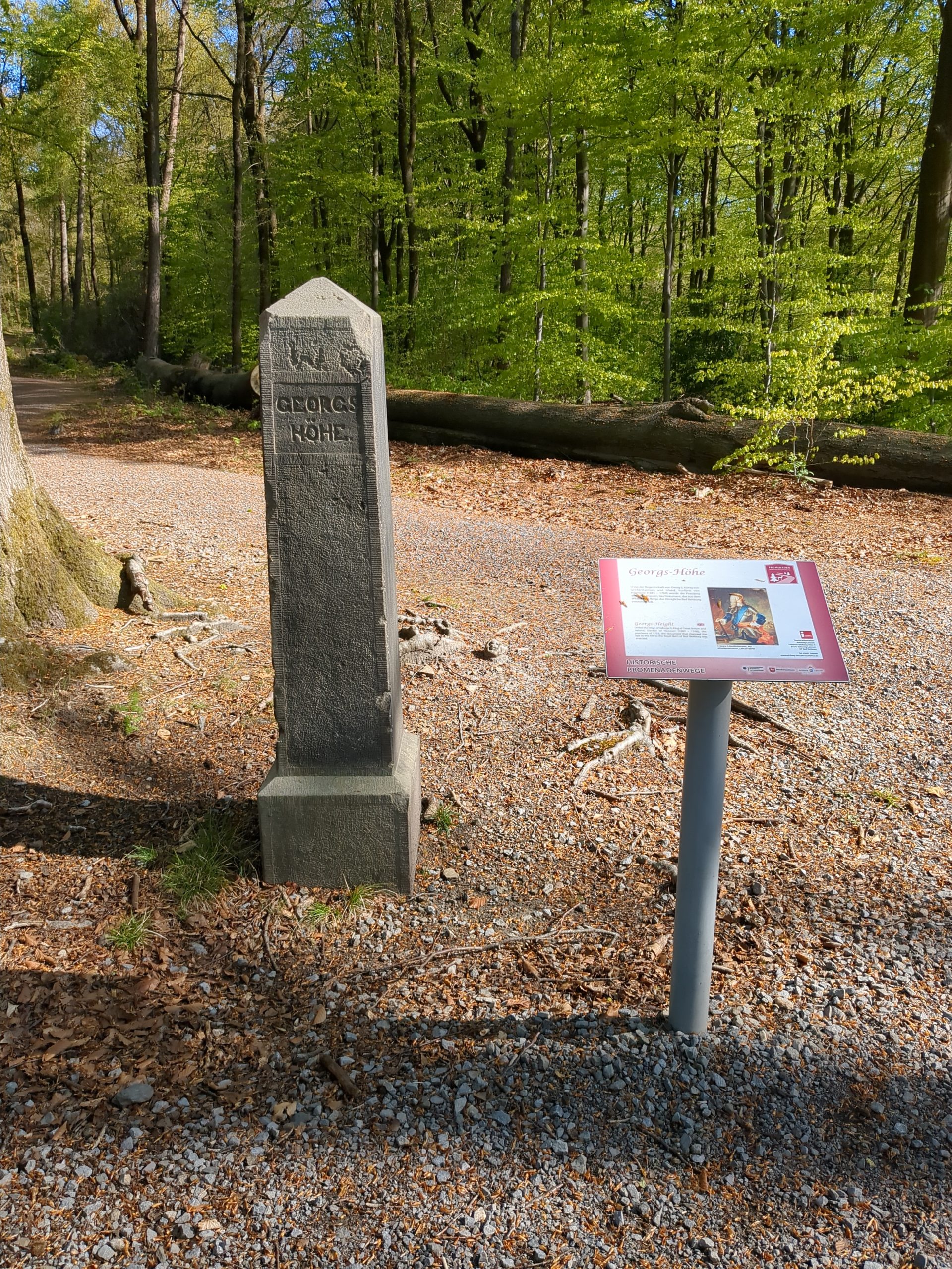 Dann geht es aber endlich los und durch die Kuranlagen von Bad Rehburg geht es bald in den Wald. Hier zeigt sich einmal wieder, warum man von den Rehburger Bergen spricht. Der Anstieg ist zwar kurz, aber durchaus nicht ohne Anstrengung. Oben angekommen erreiche ich die Georgshöhe. Hier steht ein Gedenkstein, der daran erinnert, dass König Georg II, König von Großbritannien und Irland und Kurfürst von Hannover im Jahre 1752 Rehburg zum Bad erhob.
