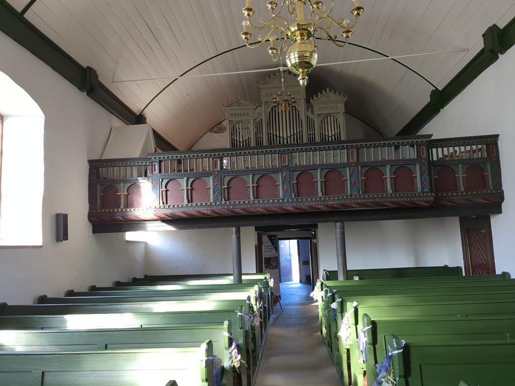 Die Küsterin der Gemeinde ist auf dem Gelände mit Gartenarbeiten beschäftigt, darum ist die Kirche offen. Ich schaue mir auch das Innere noch an, das sehr schlicht gehalten ist.