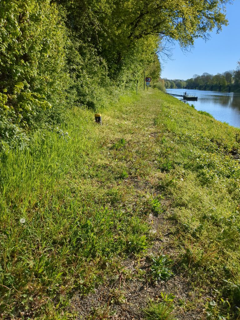 Direkt hinter der Schleuse wird es dann wieder abenteuerlich. Die Ausschilderung zeigt mir an, dass ich über eine Treppe an das Kanalufer absteigen und dort den Weg fortsetzen soll. Ein Weg ist hier allerdings kaum zu erkennen.