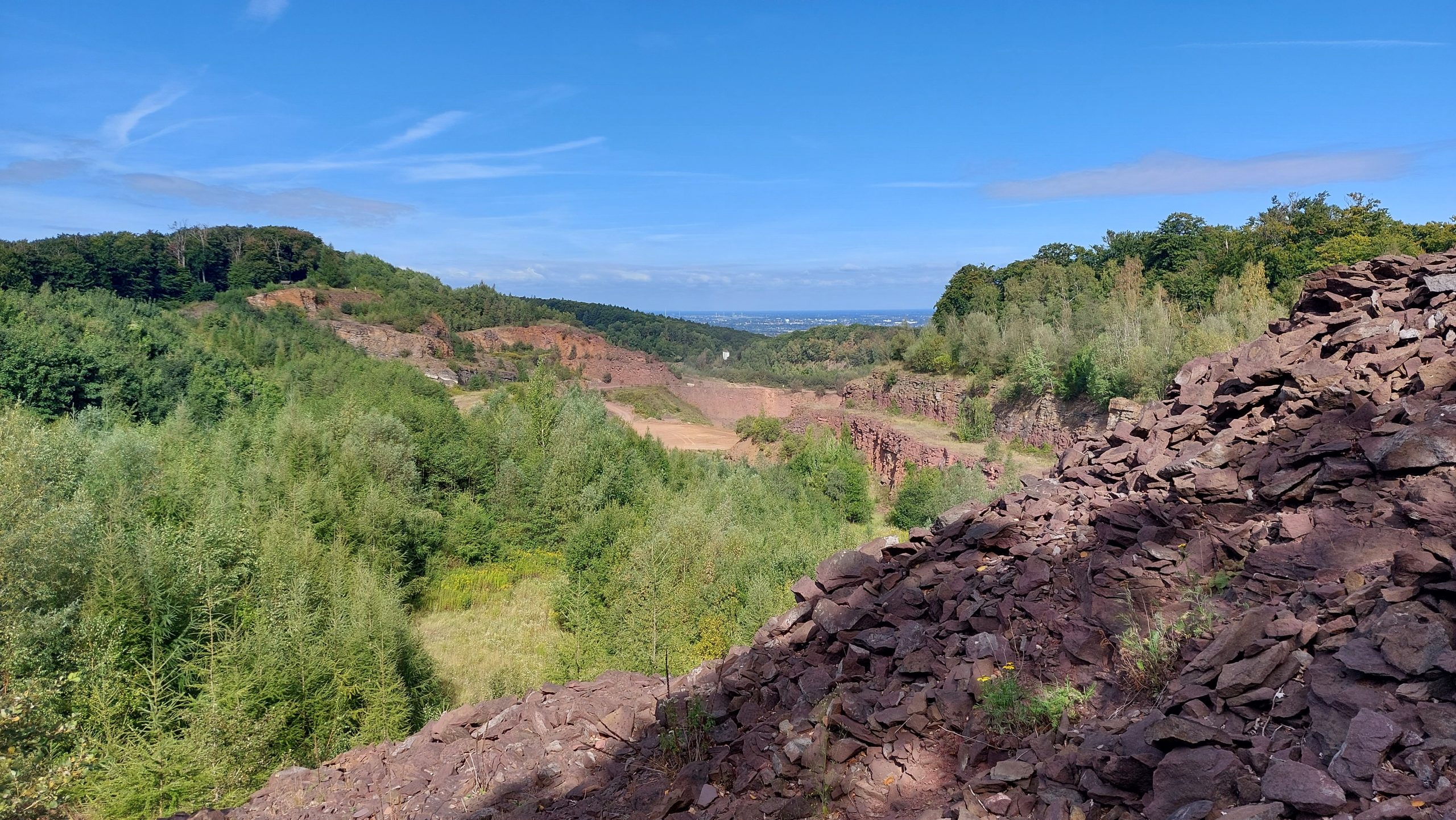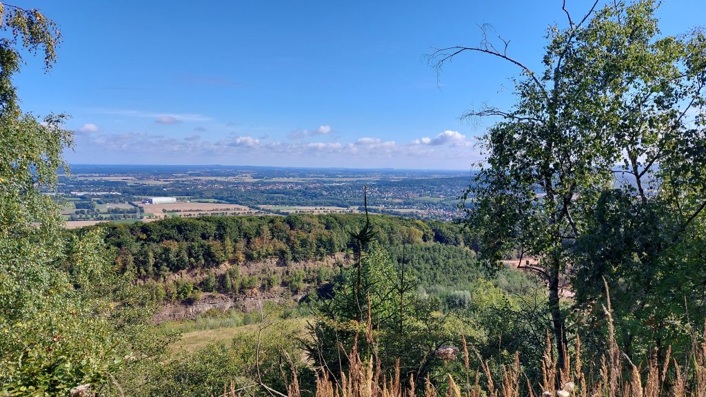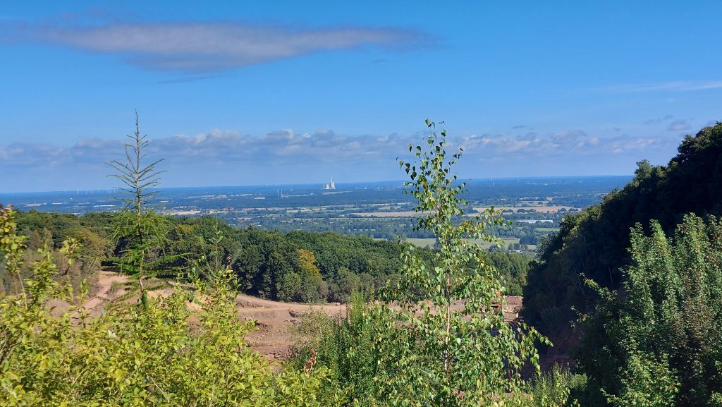 Der Weg fĂŒhrt dann weiter, immer am Rand des Steinbruchs entlang. Dabei ergeben sich wegen der klaren SichtverhĂ€ltnisse, die heute herrschen, fantastische Weitblicke in die norddeutsche Tiefebene.