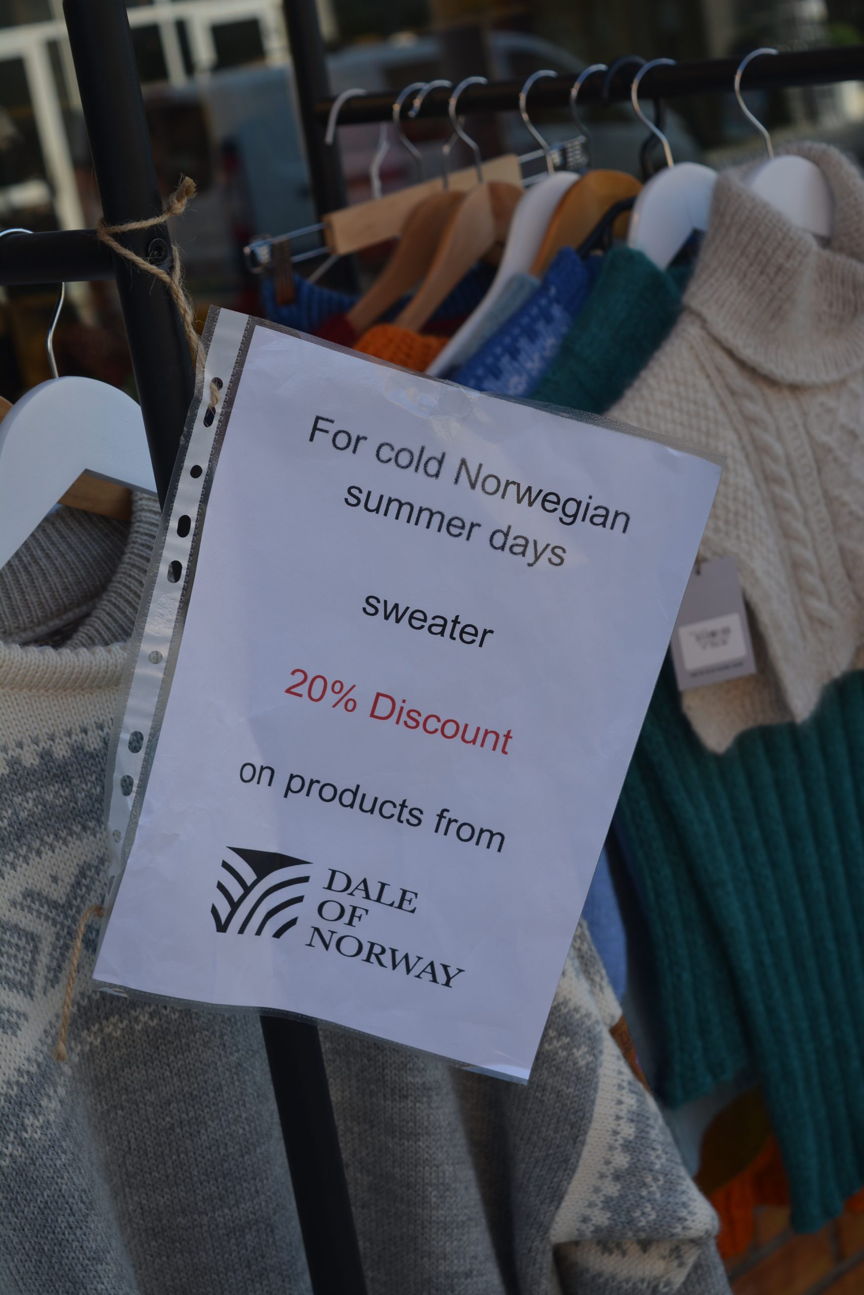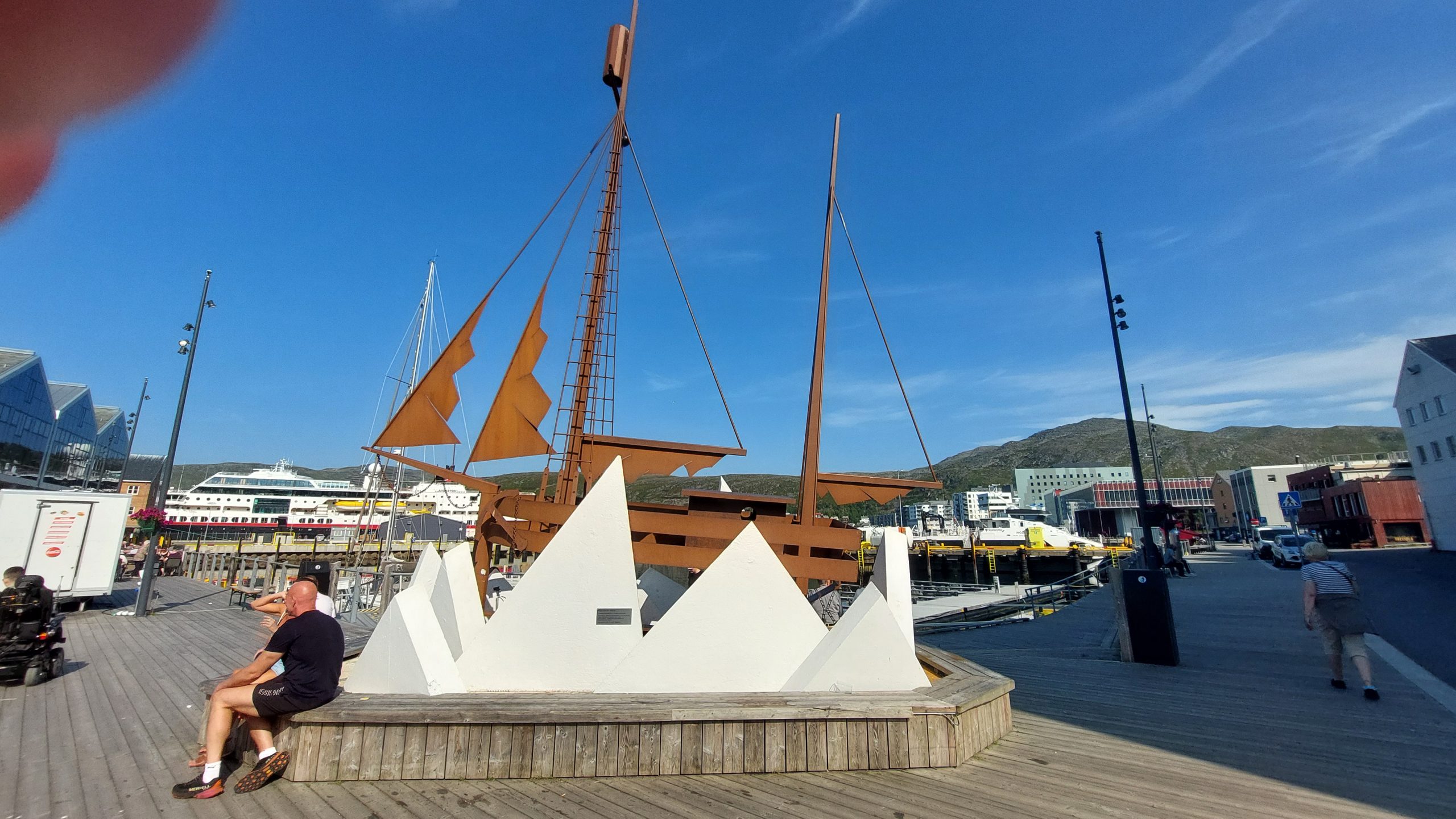 Es herrscht strahlender Sonnenschein und das Thermometer am Rathaus zeigt hier – 200 km nördlich des Polarkreises – eine Temperatur von 22°C an. Der kluge Norweger ist selbstverständlich darauf vorbereitet.