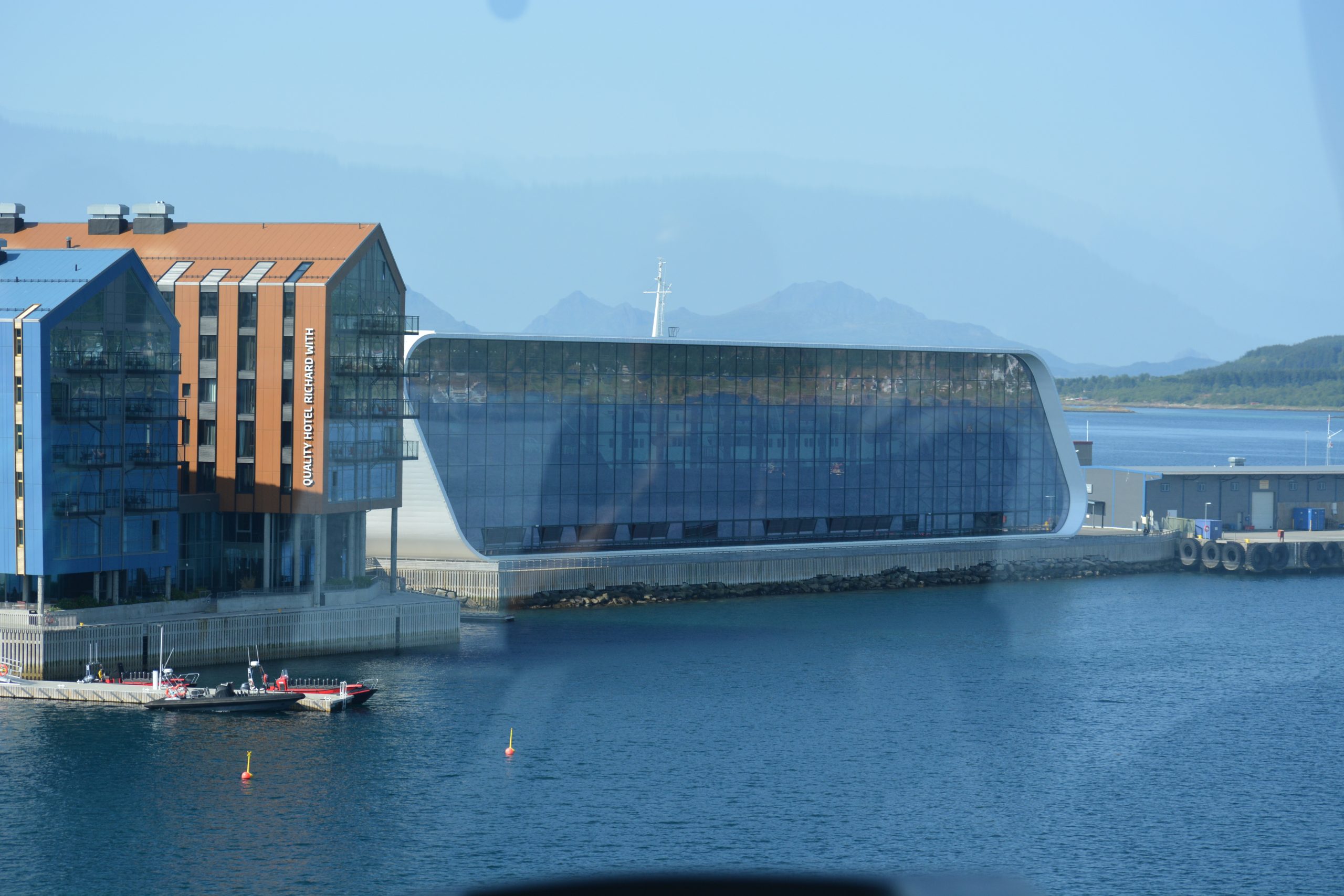 Detlef und ich verlassen hier das Schiff, da wir einen Ausflug zu einer FĂŒhrung durch das Museum der Hurtigruten gebucht haben. Das Museum befindet sich in Stokmarknes, das als nĂ€chste Hafen angelaufen wird. Um aber im Museum mehr Zeit zu haben, werden wir mit dem Bus dorthin gefahren.