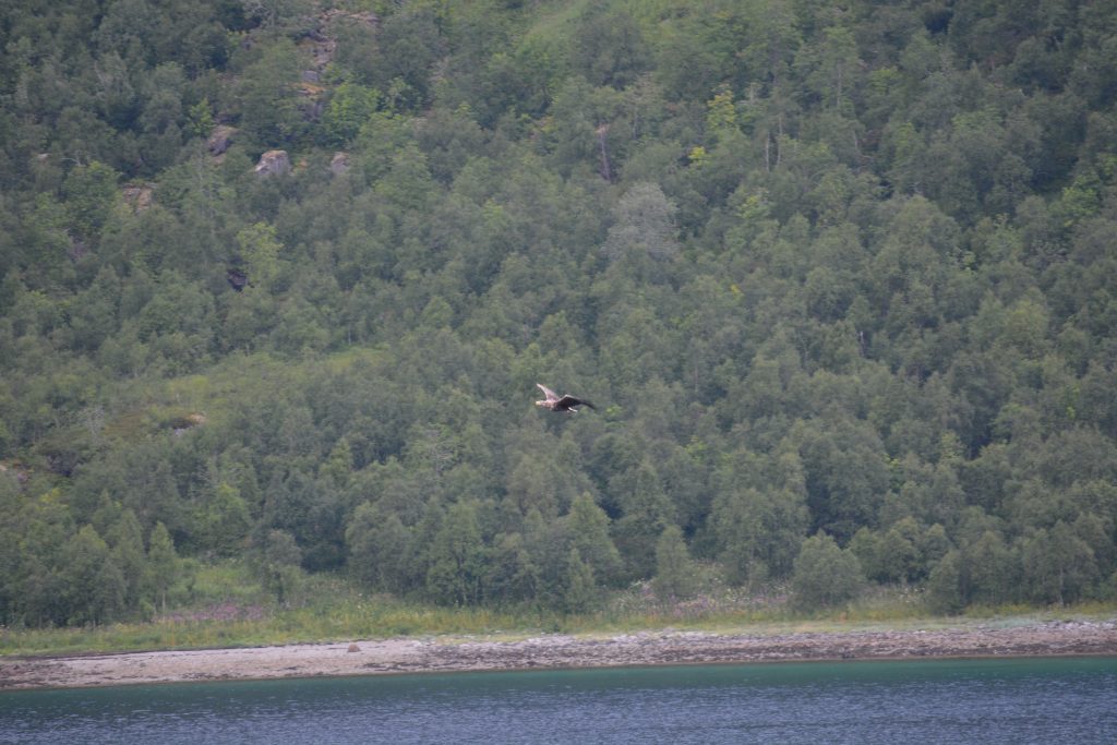 Wir bleiben allerdings an Bord der MS Midnatsol und fahren weiter. Die Entscheidung war genau richtig, denn auch wir können bereits nach kurzer Zeit die erste Seeadler sehen.