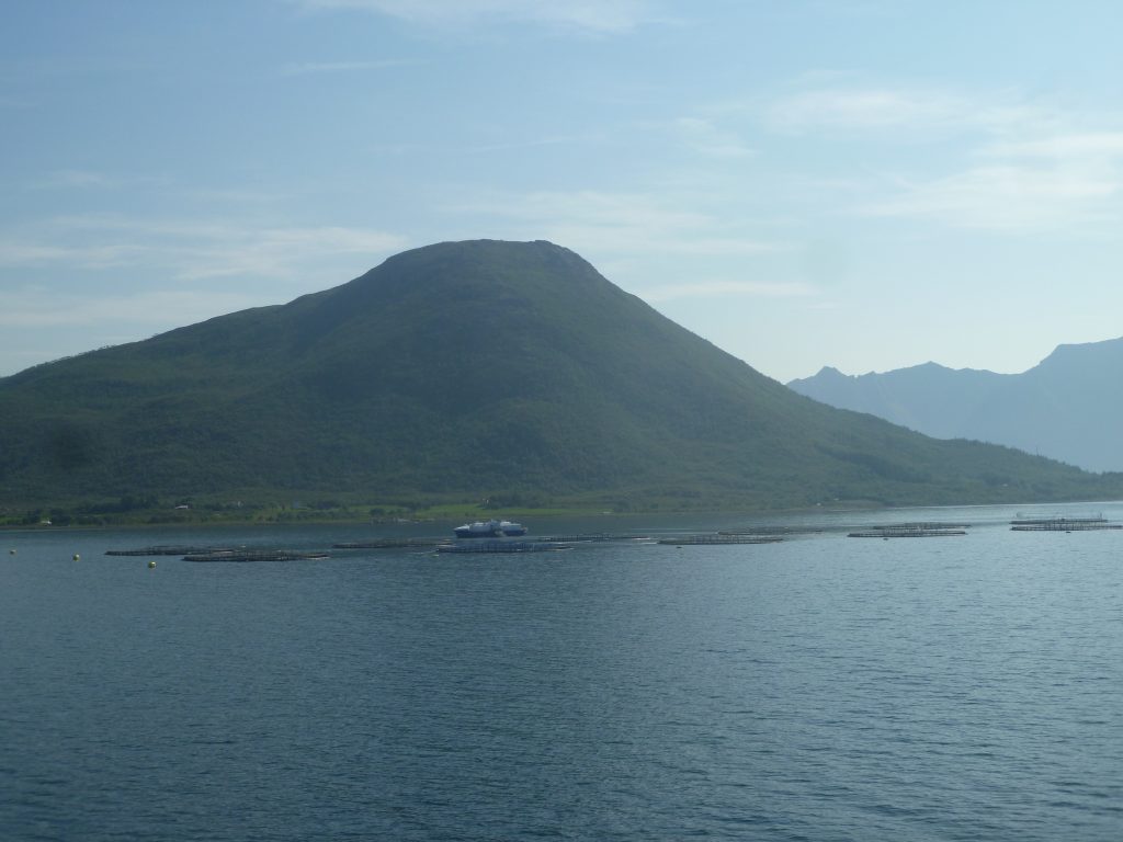 Unterwegs passieren wir mal wieder eine der unzĂ€hligen Fischfarmen, die es hier in der norwegischen Fjord- und Inselwelt zu Hunderten gibt und in denen ĂŒberwiegend Lachs, aber auch Meerforellen aufgezogen werden.